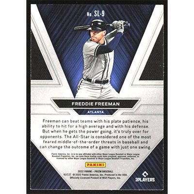 This is a 2022 Panini Prizm Sluggers Freddie Freeman baseball card. The card is #SL-9 and pictures show condition.