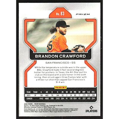 This is a 2022 Panini Prizm White Wave Brandon Crawford baseball card. The card is #83 and pictures show condition.