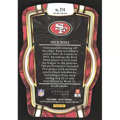 This is a 2022 Select Prizm Neon Green Die Cut Nick Bosa football card. The card is #214 and pictures show condition. This card is limited; #'d 057/299.