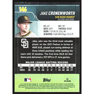 This is a 2022 Stadium Club Jake Cronenworth baseball card. The card is #146 and pictures show condition.