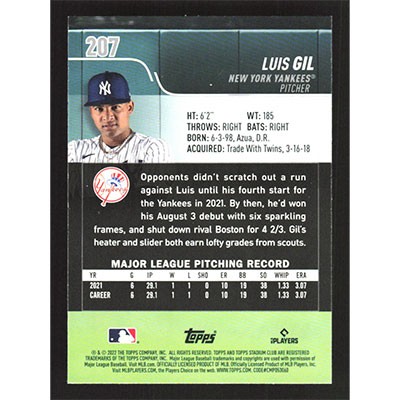 This is a 2022 Stadium Club Luis Gil baseball card. The card is #207 and pictures show condition.