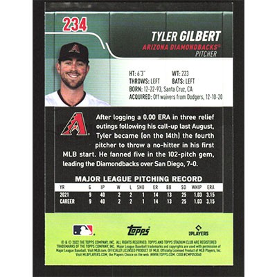 This is a 2022 Stadium Club Tyler Gilbert baseball card. The card is #234 and pictures show condition. Team(s): Arizona Diamondbacks Rookie Card (RC)