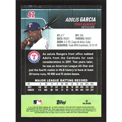 This is a 2022 Stadium Club Adolis Garcia baseball card. The card is #42 and pictures show condition.