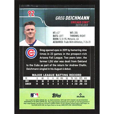 This is a 2022 Stadium Club Greg Deichmann baseball card. The card is #92 and pictures show condition.