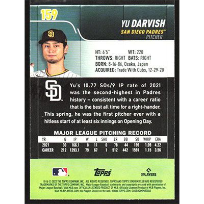 This is a 2022 Stadium Club Black Foil Yu Darvish baseball card. The card is #159 and pictures show condition.