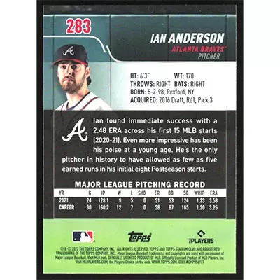 This is a 2022 Stadium Club Chrome Ian Anderson baseball card. The card is #283 and pictures show condition.