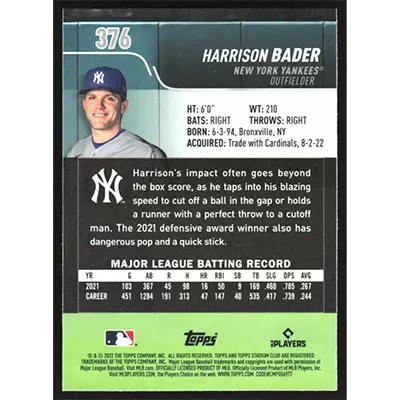 This is a 2022 Stadium Club Chrome Harrison Bader baseball card. The card is #376 and pictures show condition.