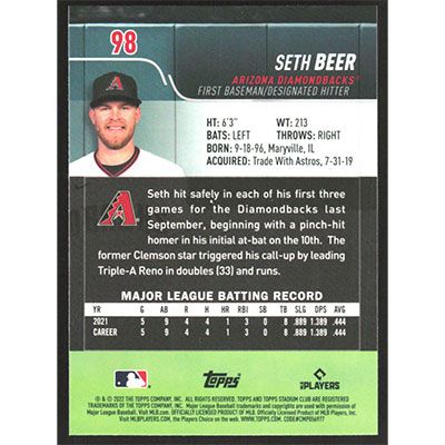 This is a 2022 Stadium Club Chrome Seth Beer baseball card. The card is #98 and pictures show condition. Team(s): Arizona Diamondbacks Rookie Card (RC)