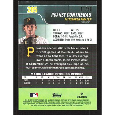 This is a 2022 Stadium Club Chrome Gold Refractors Roansy Contreras baseball card. The card is #205 and pictures show condition. This card is limited; #'d 11/50.