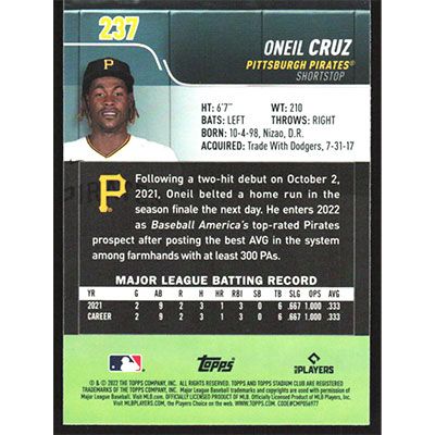 This is a 2022 Stadium Club Chrome X-Fractors Oneil Cruz baseball card. The card is #237 and pictures show condition. Team(s): Pittsburgh Pirates Rookie Card (RC)