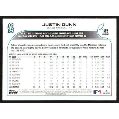 This is a 2022 Topps Justin Dunn baseball card. The card is #185 and pictures show condition.