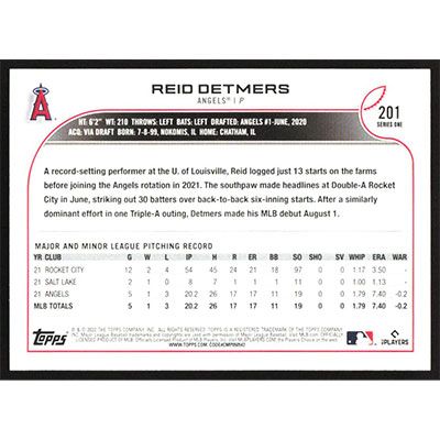 This is a 2022 Topps Reid Detmers baseball card. The card is #201 and pictures show condition.