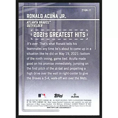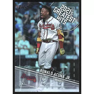 This is a 2022 Topps 2021's Greatest Hits Ronald Acuña Jr. baseball card. The card is #21GH-11 and pictures show condition.