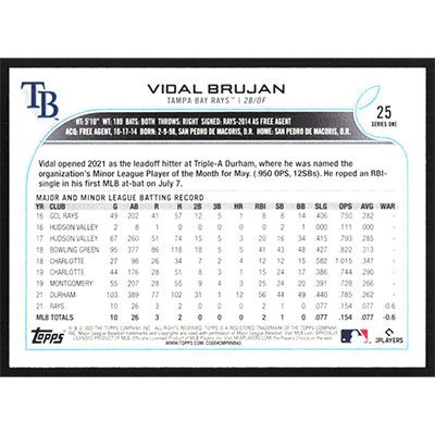 This is a 2022 Topps Vidal Brujan baseball card. The card is #25 and pictures show condition.