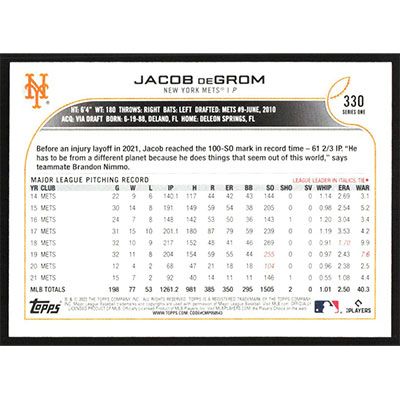 This is a 2022 Topps Jacob deGrom baseball card. The card is #330 and pictures show condition.