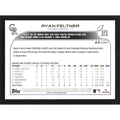 This is a 2022 Topps Ryan Feltner autographed baseball card. This card has been signed, in blue, by Ryan Feltner, and is guaranteed authentic by Ballcardz.com. The card is #373 and pictures show condition.