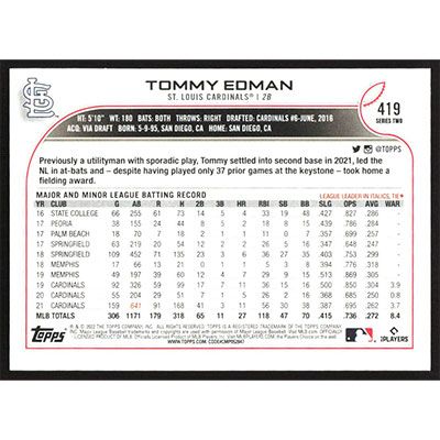This is a 2022 Topps Tommy Edman baseball card. The card is #419 and pictures show condition.