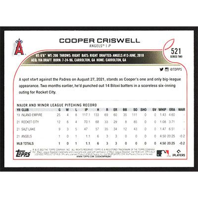This is a 2022 Topps Cooper Criswell baseball card. The card is #521 and pictures show condition.