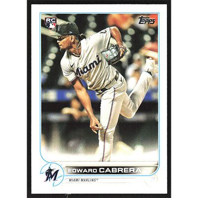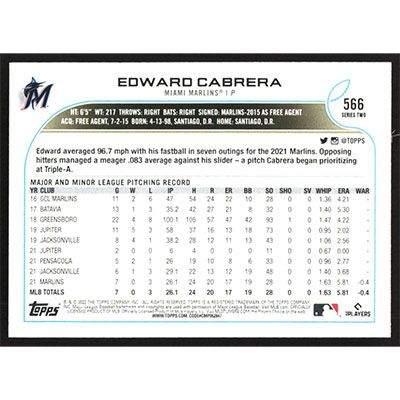 This is a 2022 Topps Edward Cabrera baseball card. The card is #566 and pictures show condition.