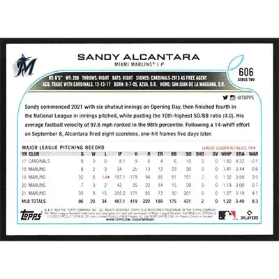 This is a 2022 Topps Sandy Alcantara baseball card. The card is #606 and pictures show condition.