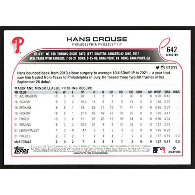 This is a 2022 Topps Hans Crouse baseball card. The card is #642 and pictures show condition.