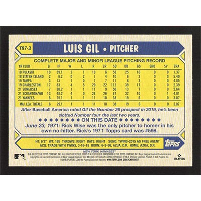 This is a 2022 Topps '87 Luis Gil baseball card. The card is #T87-3 and pictures show condition.
