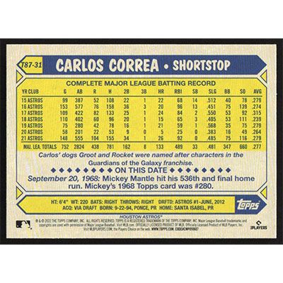 This is a 2022 Topps '87 Carlos Correa baseball card. The card is #T87-31 and pictures show condition.