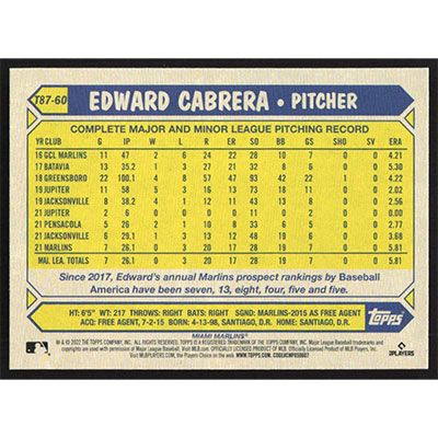This is a 2022 Topps '87 Edward Cabrera baseball card. The card is #T87-60 and pictures show condition.