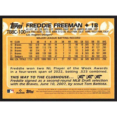This is a 2022 Topps '88 Silver Pack Chrome Freddie Freeman baseball card. The card is #T88C-100 and pictures show condition. Team(s): Los Angeles Dodgers