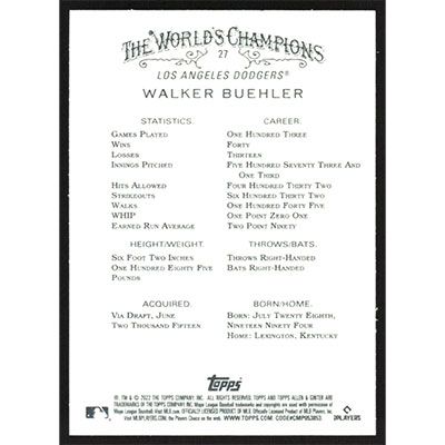 This is a 2022 Topps Allen & Ginter Walker Buehler baseball card. The card is #27 and pictures show condition.