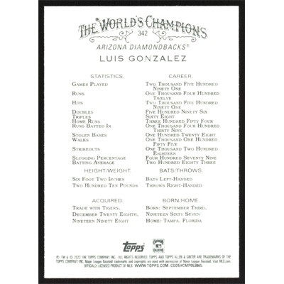 This is a 2022 Topps Allen & Ginter Luis Gonzalez short print baseball card. The card is #342 and pictures show condition. Team(s): Arizona Diamondbacks