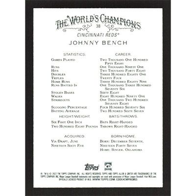 This is a 2022 Topps Allen & Ginter Johnny Bench baseball card. The card is #38 and pictures show condition.