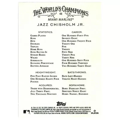 This is a 2022 Topps Allen & Ginter Jazz Chisholm Jr. baseball card. The card is #48 and is in NM-MT condition.