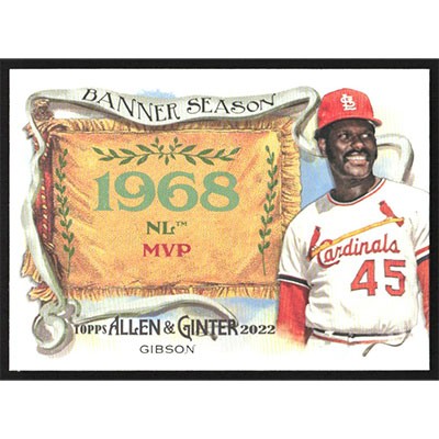 This is a 2022 Topps Allen & Ginter Banner Seasons Bob Gibson baseball card. The card is #BS-1 and pictures show condition. Team(s): St. Louis Cardinals
