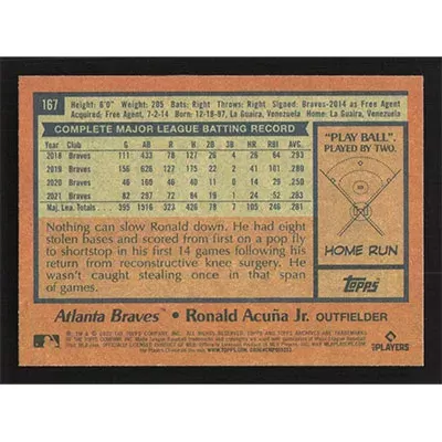 This is a 2022 Topps Archives Ronald Acuña Jr. baseball card. The card is #167 and pictures show condition.