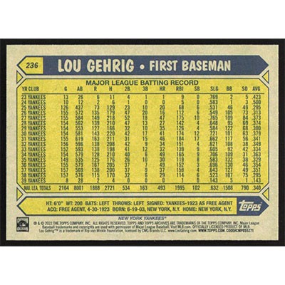 This is a 2022 Topps Archives Lou Gehrig baseball card. The card is #236 and pictures show condition.