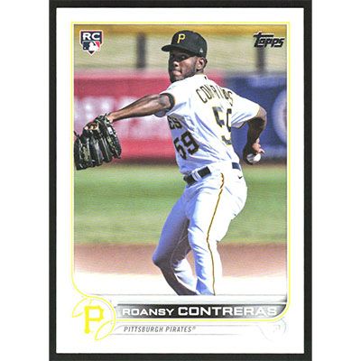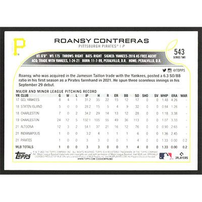 This is a 2022 Topps Base Set Photo Variations Roansy Contreras short print (Yellow P) baseball card. The card is #543 and pictures show condition. Team(s): Pittsburgh Pirates Rookie Card (RC)