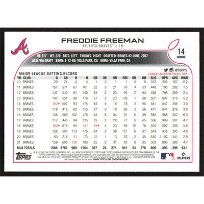 This is a 2022 Topps Chrome Freddie Freeman baseball card. The card is #14 and pictures show condition.