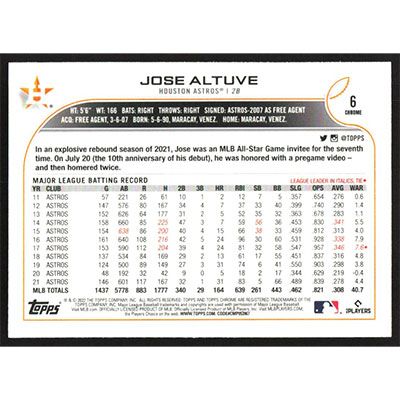 This is a 2022 Topps Chrome Jose Altuve baseball card. The card is #6 and pictures show condition.