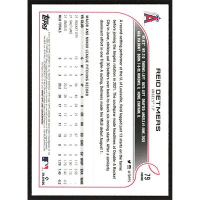 This is a 2022 Topps Chrome Reid Detmers baseball card. The card is #79 and pictures show condition.