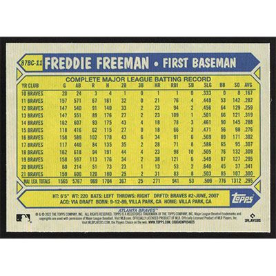 This is a 2022 Topps Chrome '87 Freddie Freeman baseball card. The card is #87BC-11 and pictures show condition.