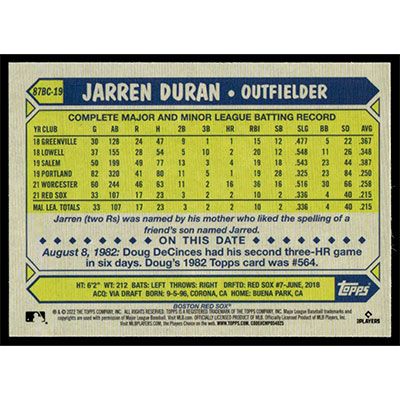 This is a 2022 Topps Chrome '87 Jarren Duran baseball card. The card is #87BC-19 and pictures show condition. Team(s): Boston Red Sox Rookie Card (RC)