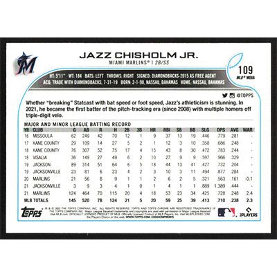 This is a 2022 Topps Chrome Logofractor Jazz Chisholm Jr. baseball card. The card is #109 and pictures show condition.