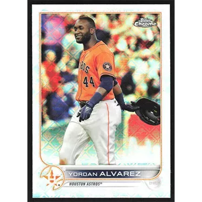 This is a 2022 Topps Chrome Logofractor Yordan Alvarez baseball card. The card is #32 and pictures show condition.