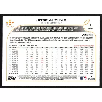 This is a 2022 Topps Chrome Negative Refractors Jose Altuve baseball card. The card is #6 and pictures show condition.