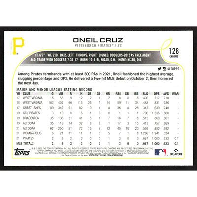This is a 2022 Topps Chrome Pink Refractors Oneil Cruz baseball card. The card is #128 and pictures show condition. Team(s): Pittsburgh Pirates Rookie Card (RC)