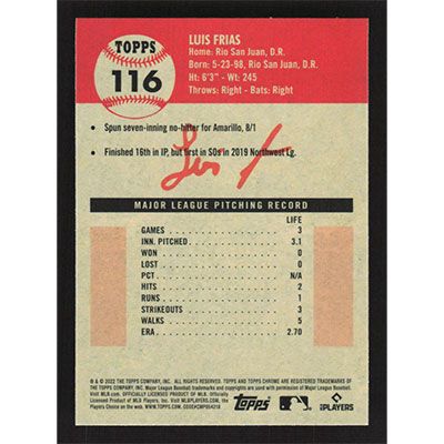 This is a 2022 Topps Chrome Platinum Anniversary Luis Frias baseball card. The card is #116 and pictures show condition. Team(s): Arizona Diamondbacks Rookie Card (RC)