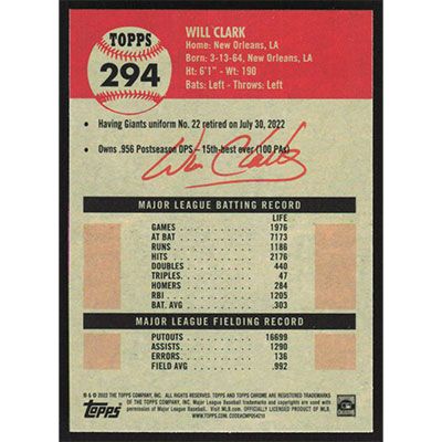 This is a 2022 Topps Chrome Platinum Anniversary Will Clark baseball card. The card is #294 and pictures show condition.