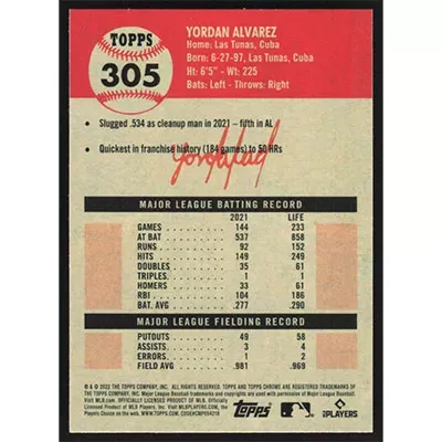 This is a 2022 Topps Chrome Platinum Anniversary Yordan Alvarez baseball card. The card is #305 and pictures show condition.