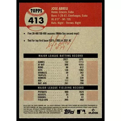 This is a 2022 Topps Chrome Platinum Anniversary Jose Abreu baseball card. The card is #413 and pictures show condition.